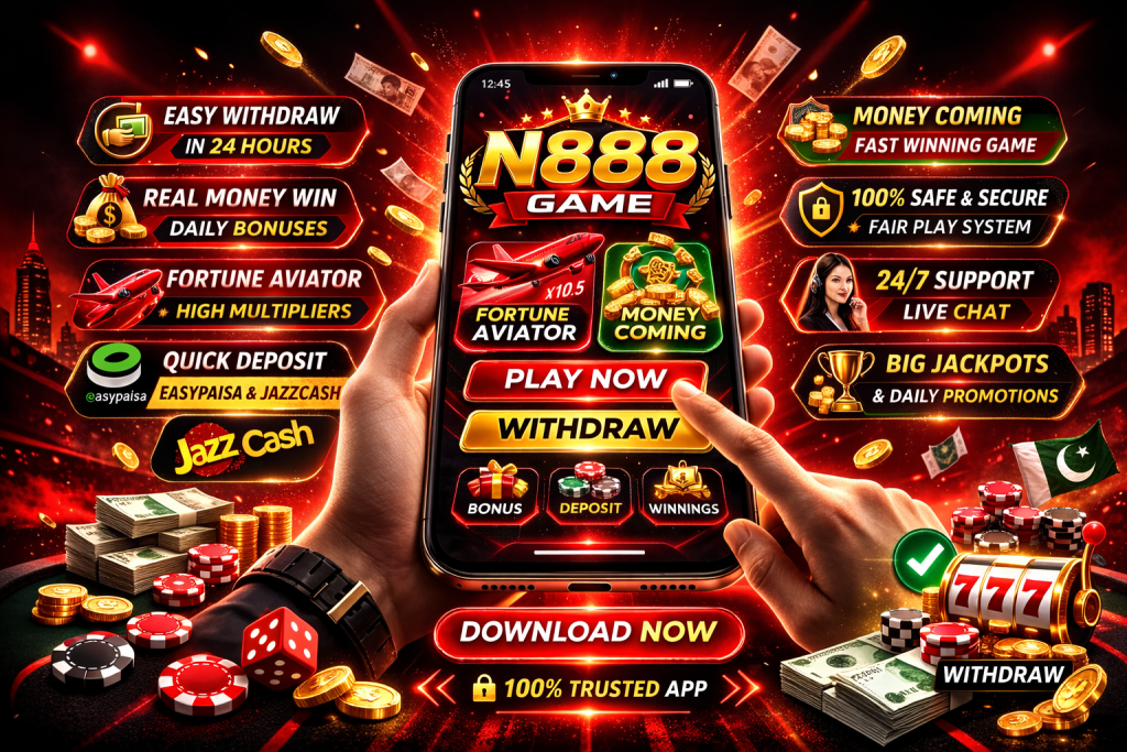 To play N888 Game and earn real money, first download the latest APK and register an account. Deposit funds using trusted methods like EasyPaisa or JazzCash to start playing instantly. Try popular games like Fortune Aviator, where predicting the plane’s rise can multiply your bets quickly. Another exciting option is Money Coming, a fast-paced game that gives frequent winning opportunities. Always set a budget and play strategically to maximize your earnings. With regular bonuses and promotions, N888 offers players both fun and real cash rewards.